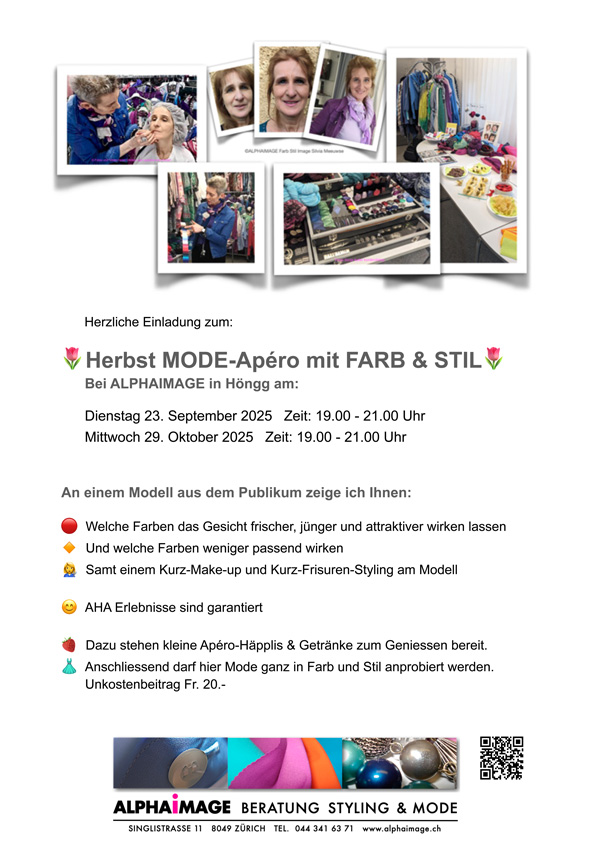 Profitiere von Silvias Schmink-Tricks und Styling-Tipps und geniesse feine Apéro-Häpplis und Getränke. Und natürlich sind die vielen Kleidungsstücke nicht nur zum Anschauen dort – anprobieren, wohlfühlen und ein neues Lieblingsstück finden!